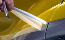 Bij de hoofdfoto: Om een mooie patroonaansluiting te krijgen, wordt in de bovenste laag folie een breuklijn gesneden. Dan mag niet door de onderste laag heen worden gesneden. Als er toch ‘door en door’ wordt gesneden, kunnen namelijk krimpnaadjes ontstaan of, in het ergste geval, lakschade.