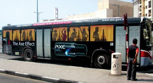 Deze busreclame voor Axe speelt in op de emotie “Wat hij meemaakt wil ik ook!” (Empathy)