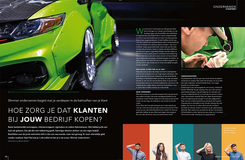 Natuurlijk moet je eerst de nodige technische vaardigheden leren en die vervolgens tot in je vingertoppen beheersen. Dat gaat verder dan het kunnen toepassen van de verschillende aanbreng- en afwerktechnieken van folies. Je moet ook weten wat kan en wat níet kan met de diverse folies. En je wilt uiteraard kwaliteit leveren en (onthechting)klachten voorkomen. De meeste starters volgen daarom eerst een kwalitatieve cursus en doen daarna lekker ervaring op in de praktijk.