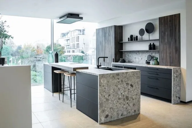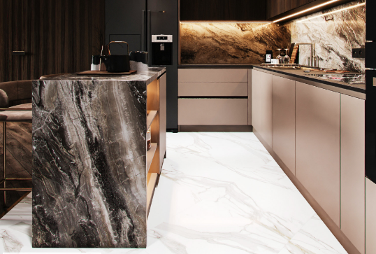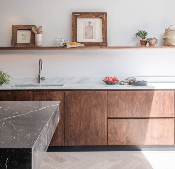 Een andere trend die zijn intrede doet zijn donkere houtsoorten als eiken en noten. Natuurlijk niet zoals in de 50erjaren met de gezellige paneeldeuren. Nee, denk aan strakke greeploze deurtjes en dan gecombineerd met wit marmer. Mooi hoor!