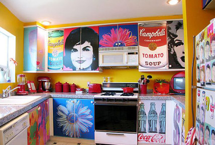 Een andere leuke trend die zich geweldig leent voor een restyle zijn vrolijke gekke prints. Zoals deze keuken met afbeeldingen van Andy Warhol. Een gewaagde keuze maar hoe gaaf! En.. als je ’t zat bent kan er gewoon weer een sjieke interieurfolie op!