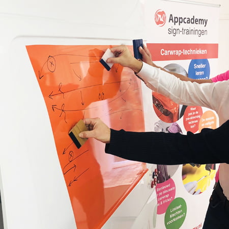 Je kunt nog zo’n mooie Stanley hamer vasthouden, als je niet weet hoe je hem moet hanteren voor de optimale tik, heb je er niet veel aan. Een beginneling gebruikt misschien zijn kracht verkeerd, houdt de hamer niet goed vast, en moet leren welke beweging het meeste effect heeft. Zo is het ook met rakelen. Het is enorm belangrijk dat je de rakel goed vasthoudt, dat je de rakel onder de goede hoek op de folie zet, dat je je kracht optimaal gebruikt en weet welke rakelslagen het meeste effect hebben. Met een goede techniek zal het rakelen je veel gemakkelijker afgaan en word je, zonder meer inspanning te hoeven leveren, echt sneller. Tijdens de Appcademy trainingen ‘Carwrap’ en ‘Applicatie en beletteringstechnieken’ oefenen we dit soort rakeltechnieken en nog veel meer.